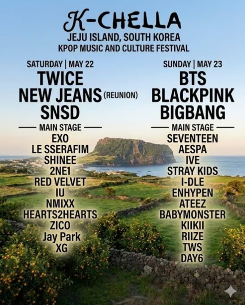 この構想はSNS上で急速に拡散し、ファンの間では仮想ポスターが登場。済州島の名所を背景に、グループBTS(防弾少年団)やBLACKPINK(ブラックピンク)をヘッドライナーに据えたラインナップなどが話題となっている。